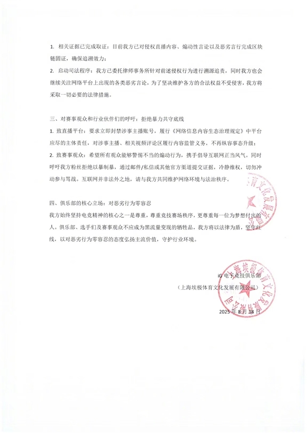 这些言论进一步激化了矛盾,随后他的二路解说权被官方剥夺。恶意诽谤及煽动性网络暴力,被部分iG粉丝举报至战队投资人处,